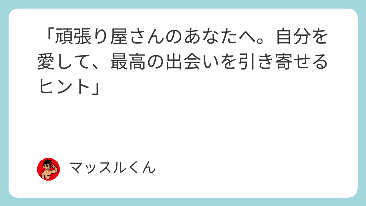 マッスルくん自分を大切に扱えるようになった先には、必ず最高の出会いが待っている。これは俺が保証する。自分の足で立っている姿は、何よりも美しいし、誰からも奪えない価値があるからね。